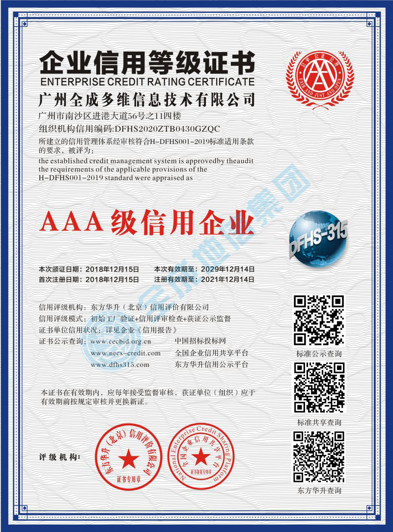 企業(yè)信用等級證書AAA級質(zhì)量服務誠信單位