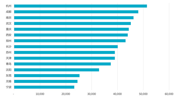 15個(gè)新一線城市在智慧城市搜索熱度上均保持了較高水準(zhǔn),其中,杭州、成都大體處于第一梯隊(duì),南京、重慶、武漢、蘇州、西安、天津、鄭州、長沙、沈陽、青島這10個(gè)城市處于第二梯隊(duì),而寧波、東莞、無錫3個(gè)城市則相對(duì)落后。