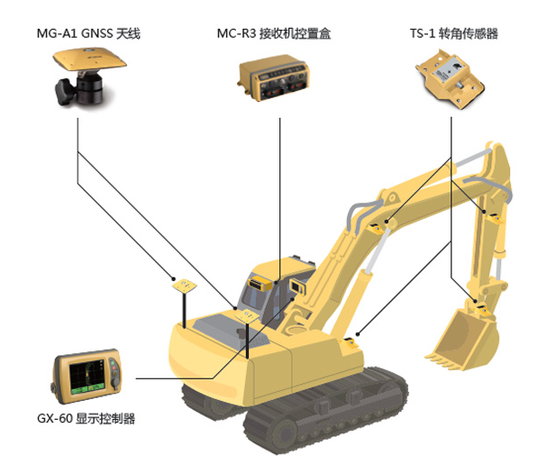 在導(dǎo)入設(shè)計(jì)數(shù)據(jù)后,系統(tǒng)根據(jù)GNSS天線和傳感器的數(shù)值計(jì)算出鏟刀尖處的坐標(biāo),并與設(shè)計(jì)數(shù)據(jù)進(jìn)行對(duì)比,計(jì)算顯示出填挖量。系統(tǒng)適用于所有型號(hào)的挖掘機(jī),不需要更改機(jī)器的油路電纜,安裝簡(jiǎn)便,如有需要能迅速移機(jī)。系統(tǒng)操作簡(jiǎn)單,技術(shù)人員設(shè)置好以后,只需簡(jiǎn)單培訓(xùn),駕駛員就能熟練使用。