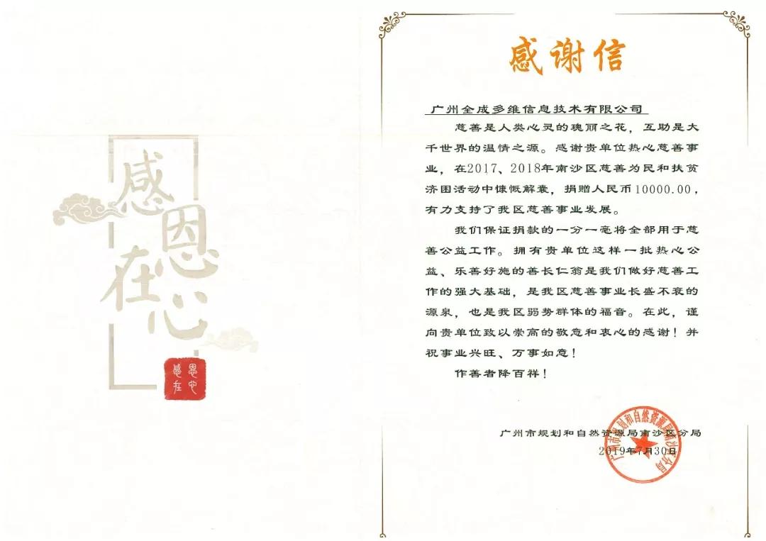 信中指出,全成地信集團(tuán)在2017年、2018年南沙區(qū)慈善為民和扶貧濟(jì)困活動(dòng)中慷慨解囊,為南沙區(qū)慈善事業(yè)發(fā)展做出了有力的支持,全面彰顯了民營(yíng)企業(yè)的社會(huì)責(zé)任與擔(dān)當(dāng)。同時(shí)廣州市規(guī)劃和自然資源局南沙區(qū)分局表示,捐款的一分一毫將全部用于慈善公益,幫助弱勢(shì)群體走出困境。