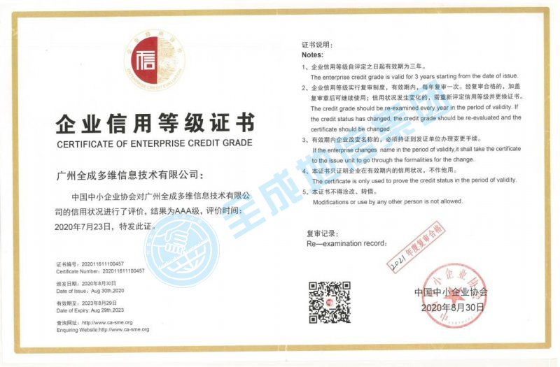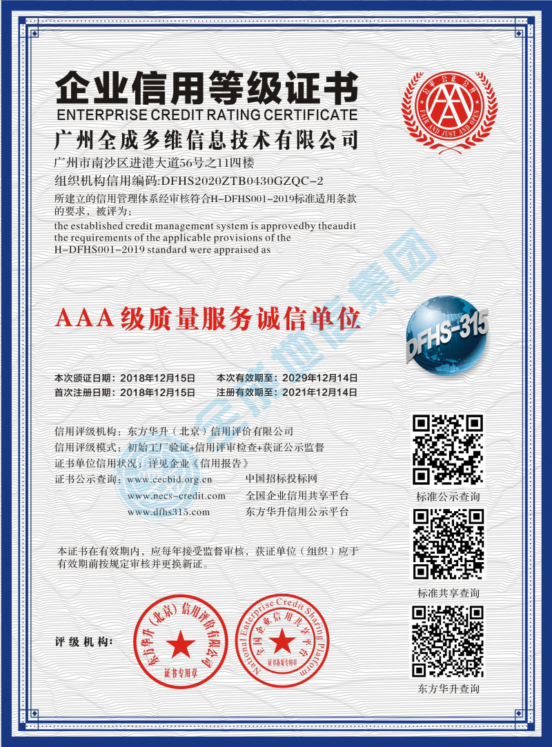 企業(yè)信用等級證書AAA級質(zhì)量服務誠信單位